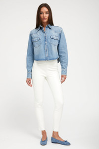 A luxe, cropped take on a classic utilitarian style button down; this western collared button down is made from 100% cotton for a classic denim look and feel. Finished with pearlescent buttons and western-style front chest pockets. COLOR: Paradis - light vintage blue stone wash FIT & MEASUREMENTS - Fits true to size - Cropped fit - Anna is 5'11 & wears size Small PRODUCT DETAILS - 100% Cotton - Non-Stretch Denim - Japanese Denim - Functional front pockets - Machine wash cold, tumble dry low