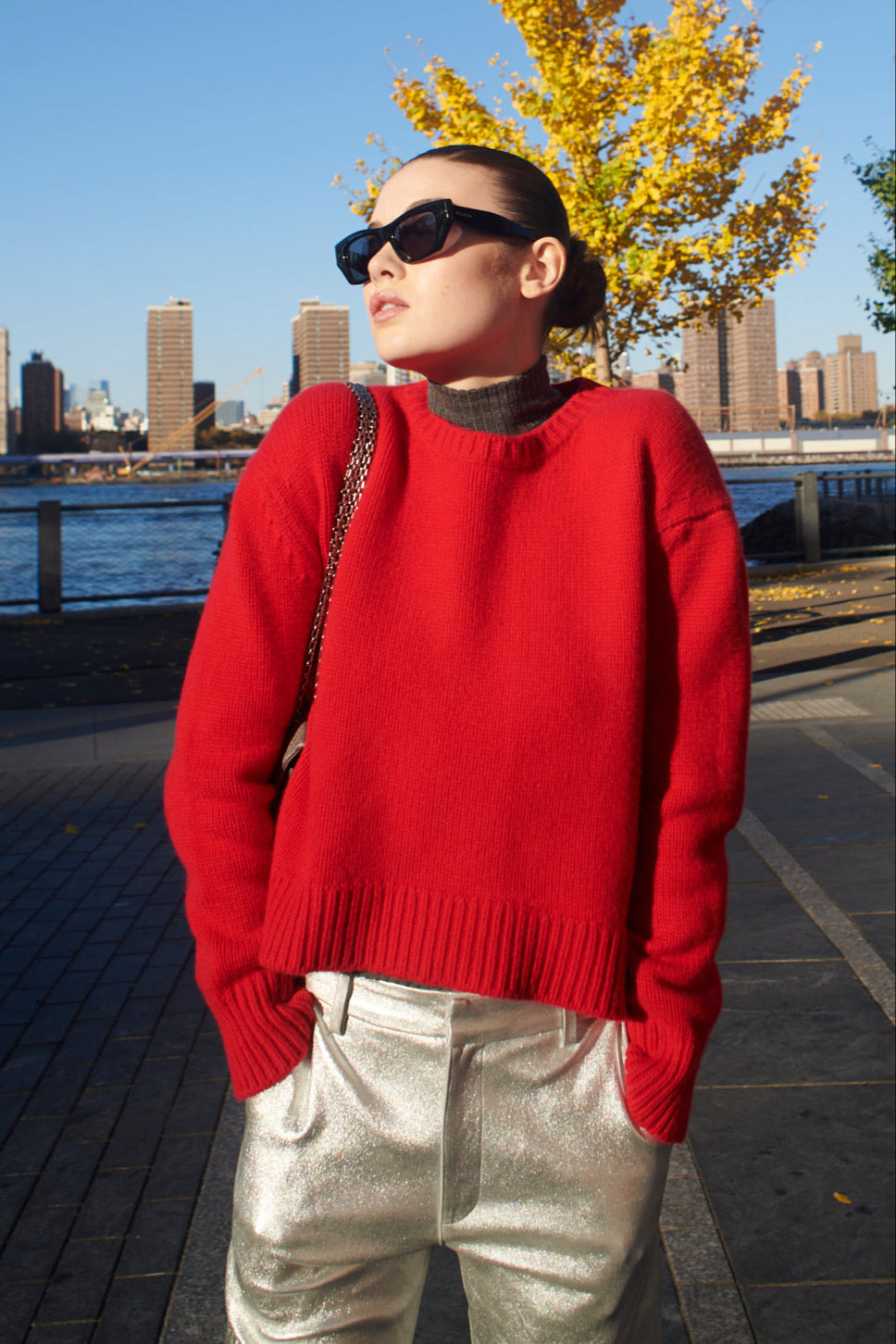 This luxe cashmere crewneck has a relaxed fit for the most elegant drape. Made from our high quality Mongolian yarn, this thick, double-weight fabric is ultra-soft and will keep you warm no matter what. With roomy shoulders and a hem that hits below your natural waist, it's the go-to sweater for both, casual and dressy looks. COLOR: Red FIT & MEASUREMENTS - Fits true to size - Cropped fit - Anna is 5'11 & wears size Small PRODUCT DETAILS - 100% Cashmere - Sustainably grown, organic yarn - Dry clean only