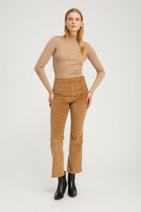 Our best selling body of the Ankle Flare pants, cut in a stretchy and breathable corduroy material with elongating pintucks down the front. Fitted with our Japanese elastic waistband, these pants feature a high rise and skinny fit, with a subtle flare at the ankle for an effortlessly flattering fit. COLOR: Sepia FIT & MEASUREMENTS - Fits trueto size - 28.8" inseam, 8" leg opening - Emma is 5'10" & wears size Small PRODUCT DETAILS - 77% Cotton, 22% Tencel, 1% Elastic - Elastic waistband, pull on fit - Pintucks - Machine wash cold, tumble dry low