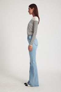This 100% Cashmere crewneck is made from our ultra-soft, high quality Mongolian yarn, and has a relaxed silhouette making it a comfortable wardrobe classic. This lightweight sweater is the perfect base for any outfit with room to layer, making it easy to tuck in or leave out of any bottom. COLOR: Ivory, Black Stripes FIT & MEASUREMENTS - Fits true to size - Kiana is 5'11 & wears size X-Small PRODUCT DETAILS - 100% Cashmere - 7gg - Sustainably grown, organic yarn - Lightweight - Room for layering - Dry clean only