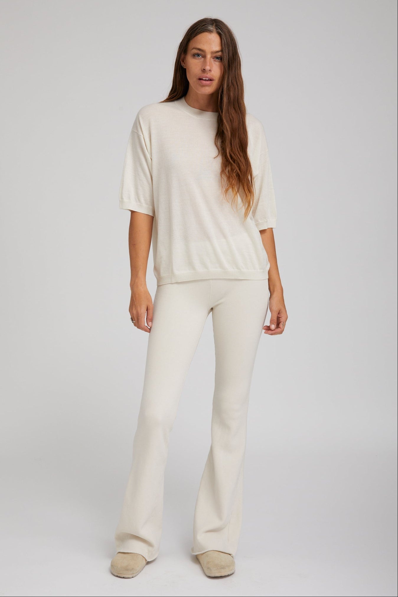 Our vintage white micro flare pants are elegant and very versatile. Made from the softest stretchy cotton-blend, they elongate the leg and will keep you feeling comfy and cozy without compromising on style. A flattering silhouette, they can be dressed up or laid back, depending on the mood or the occasion. They’re perfect for the office, lounging at home, or traveling.Style yours with the matching top, sneakers, or heeled boots. COLOR: Vintage White 50% poly 38% cotton 12% rayon Machine wash cold, tumble dry low Runs small - for a more relaxed fit size up. 33" Inseam Model wears size Extra Small FIT & MEASUREMENTS - Runs small - for a more relaxed fit size up. - 33" Inseam - Model wears size Extra Small PRODUCT DETAILS - 50% poly 38% cotton 12% rayon - Machine wash cold, tumble dry low