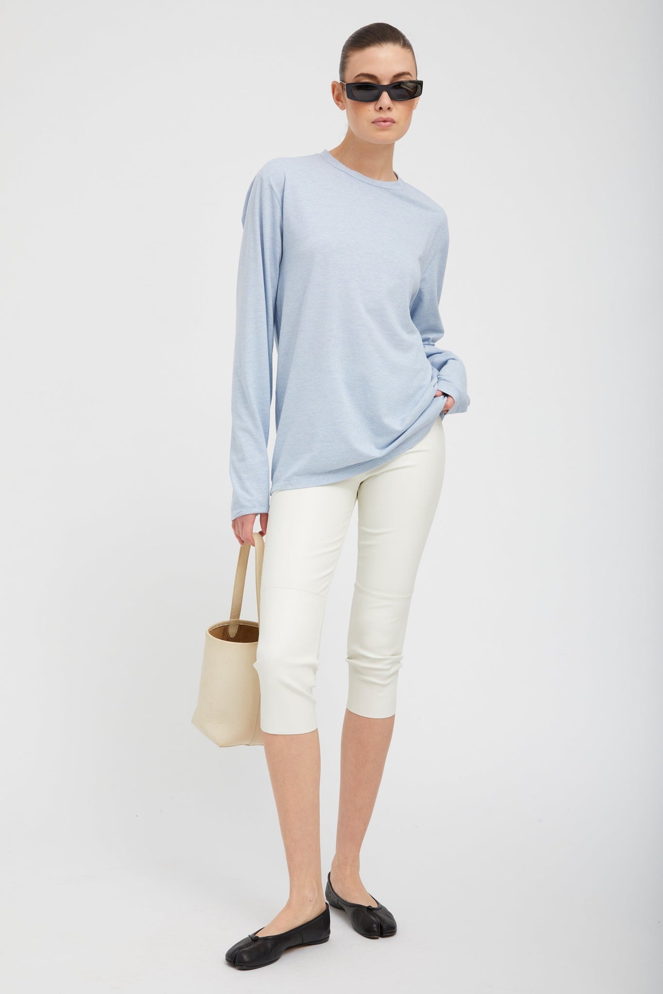 Our capri leggings will quickly become an essential part of your wardrobe. Made from our signature French stretch-leather, they feel like a second-skin due to their extreme breathability technology, and can be worn year-round. Fitted with our thin, high-rise waistband, they easily conform to your body for a figure-sculpting fit. Wear with a cashmere sweater and ballet flats for an ultra chic look. COLOR: White FIT & MEASUREMENTS - Fits true to size - White leather naturally stretches 1/4-1/2 size. To maintain a fitted look, or if in-between sizes, we recommend sizing down. - Meant to fit tight at first-try. - High-rise, skinny fit PRODUCT DETAILS - 100% French Lambskin - Stretch Leather - Cotton x Lycra lining - Pull-on fit, elastic waistband - Eco friendly, hypoallergenic and chrome-free vegetal dyed - Leather specialist clean only