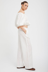Our Isabel Top is made from ultra lightweight and breathable linen that will keep you feeling cool and airy all season long. Featuring an off the shoulder silhouette and puff sleeves, this is the perfect top to elevate any look, especially when paired with the matching drawstring pants. COLOR: White FIT & MEASUREMENTS - Fits true to size - Kennedy is 5'11 & wears size Small PRODUCT DETAILS - 57% Linen, 43% Cotton - Machine wash cold, lay flat to dry