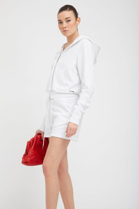 Meet the slightly fitted and more feminine take on a classic zip-up hoodie. Made from a blend of plush cotton-fleece, this ultra-soft sweatshirt falls just below the natural waist, easily complimenting any bottom. Throw it over your workout set or get the full look with the matching sweatshorts. COLOR: White FIT & MEASUREMENTS - Fits true to size - Slightly cropped fit - Kennedy is 5'11 & wears size Small PRODUCT DETAILS - 50% Polyester, 38% Cotton, 12% Rayon - Hoodie - Front zipper closure - Side slant pockets - For first wash, machine wash cold by itself - Machine wash cold, tumble dry low - *Due to the soft nature of the fabric, slight pilling may occur