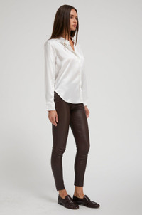 Our take on the classic collared button down, but made in a luxurious, featherweight silk with a slight sheen. Designed to have a slightly more slimming fit, this button down pairs well with our silk pants or your favorite leather trousers. COLOR: White FIT & MEASUREMENTS - Fits true to size - Slim Fit - Model wears size Small PRODUCT DETAILS - 100% Silk - Dryclean only
