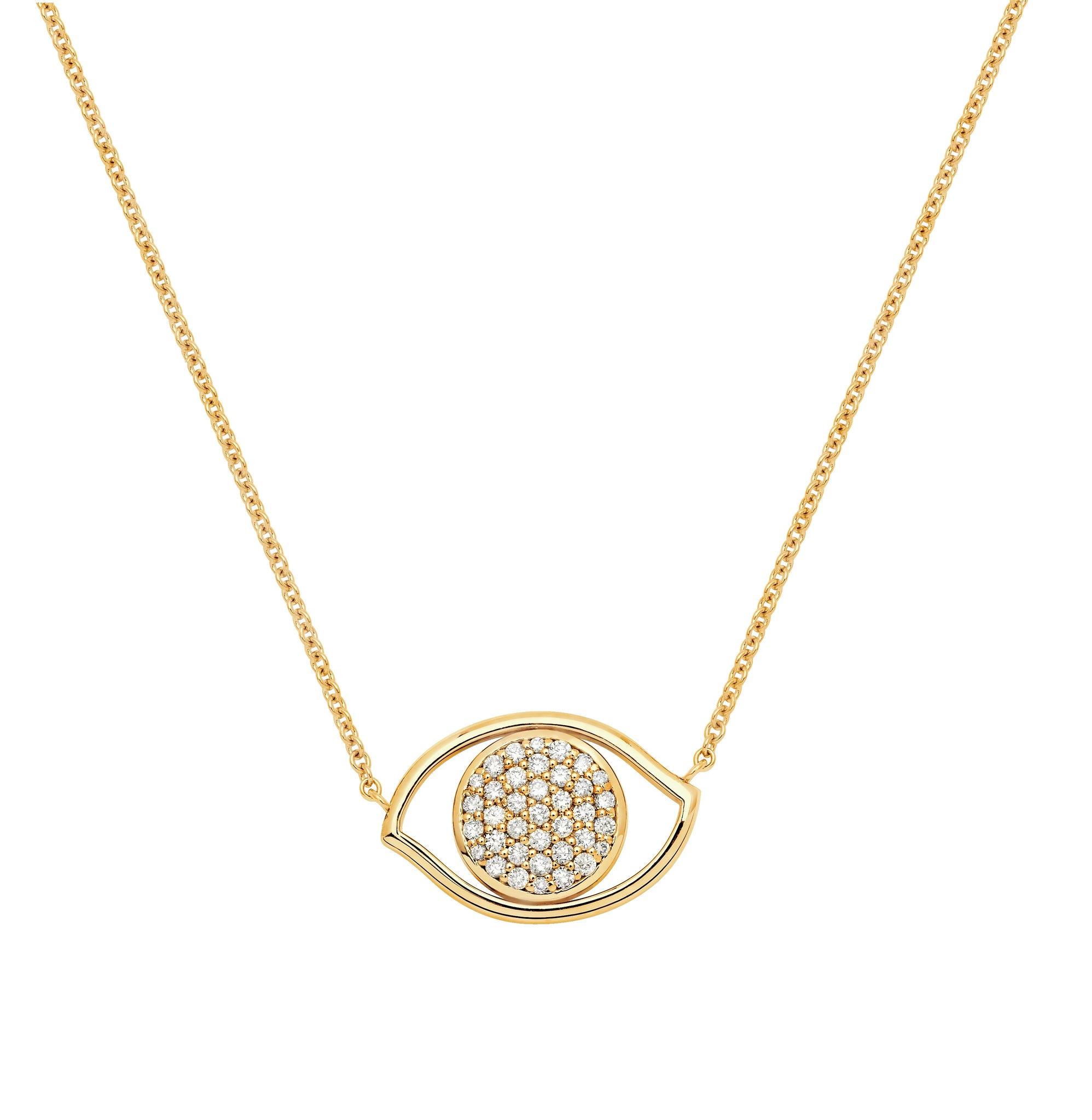 A diamond encrusted necklace byAmbre Victoria® Jewelry designed exclusively for SPRWMN. A symbiotic symbol of luck and protection, the evil eye necklace is crafted entirely in 18K Yellow Gold. The dainty eye-shaped necklace design features shimmering diamonds on the pupil of the eye. COLOR:Yellow gol PRODUCT DETAILS - 18K Yellow Gold - VS1 Clarity - Medium cts Diamonds in Pupil - One Size - Lobster hook clasp