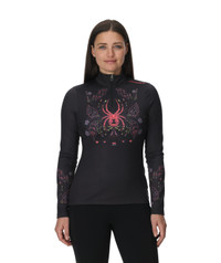 The custom Spyder prints on the Vivid 1/2 zip t-necks feature unique designs that can go with nearly any outfit. This stretch polyester/elastane t-neck is an ideal moisture-wicking layer while out on the mountain or as a light layer doing any sporty activity. - 83% RECYCLED POLYESTER / 17% ELASTANE - 83% Recycled, 17% Elastane Peached Stretch Double Knit with Wicking - Components are produced without PFAS chemicals - YKK® Reverse coil center front zipper - Custom graphics - CB Length: Size M: 25"" - Fit: Fitted - 38B013500_BLK