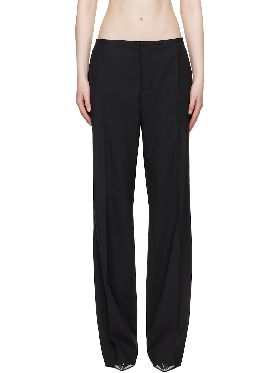 Plain-woven stretch polyester- and wool-blend trousers. · Wide-leg · Low-rise · Four-pocket styling · Zip fly · Creased legs · Logo patch at back waistband Supplier color: Black 54% polyester, 44% wool, 2% elastane. Made in Lithuania 251843F087003