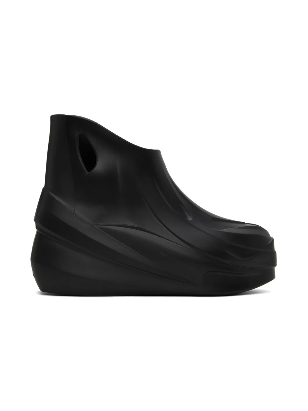 Ankle-high EVA foam rubber Chelsea boots in black. · Square toe · Cut out at outer side · Logo embossed at outer side · Sculpted rubber midsole and heel · Treaded rubber sole · Platform: H1 in · Heel: H3 in Supplier color: Black Rubber.