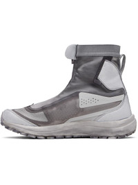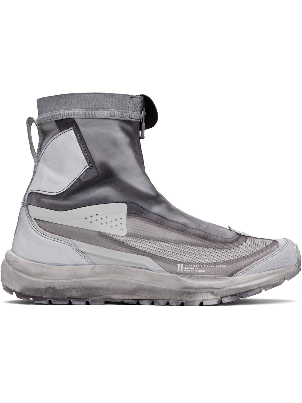High-top GORE-TEX® canvas, taffeta, and grained leather sneakers. · Object-dyed · Smudging and perforations throughout · Leather cap toe · Logo printed at zip closure · Concealed lace-up closure · Elasticized collar · Logo printed at outer side · Pull-loop at heel tab · Logos bonded at heel tab and counter · Mesh lining · Treaded Contagrip® rubber sole Part of the 11 by Boris Bidjan Saberi x Salomon collaboration. Supplier color: Light grey Upper: leather, textile. Sole: rubber. Made in China 252610M236001