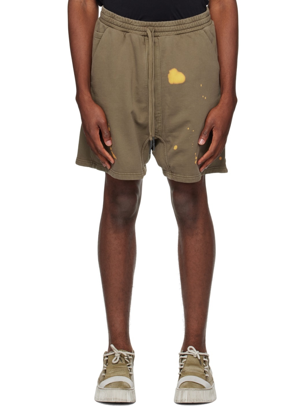 Garment-dyed cotton fleece shorts. Bleached effect throughout. · Drawstring at elasticized waistband · Six-pocket styling · Zip pocket at outseams · Drawstring at back Each item is unique. Please note that coloration may vary. Supplier color: Dark oak camo 100% cotton. Made in Portugal 232610M190002