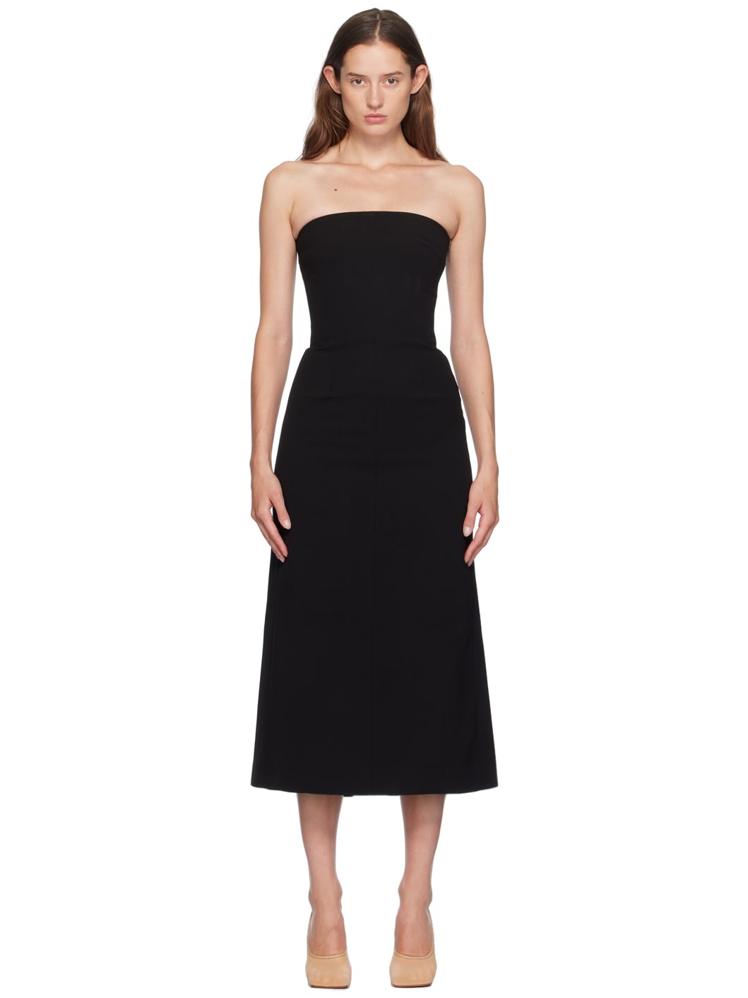 Polyester crepe dress. · Straight neck · Boning at bodice · Zip closure and pleats at back · Full recycled polyester sateen lining Supplier color: Nero Body: 100% polyester. Lining: 100% recycled polyester. Made in United Kingdom 242427F054003