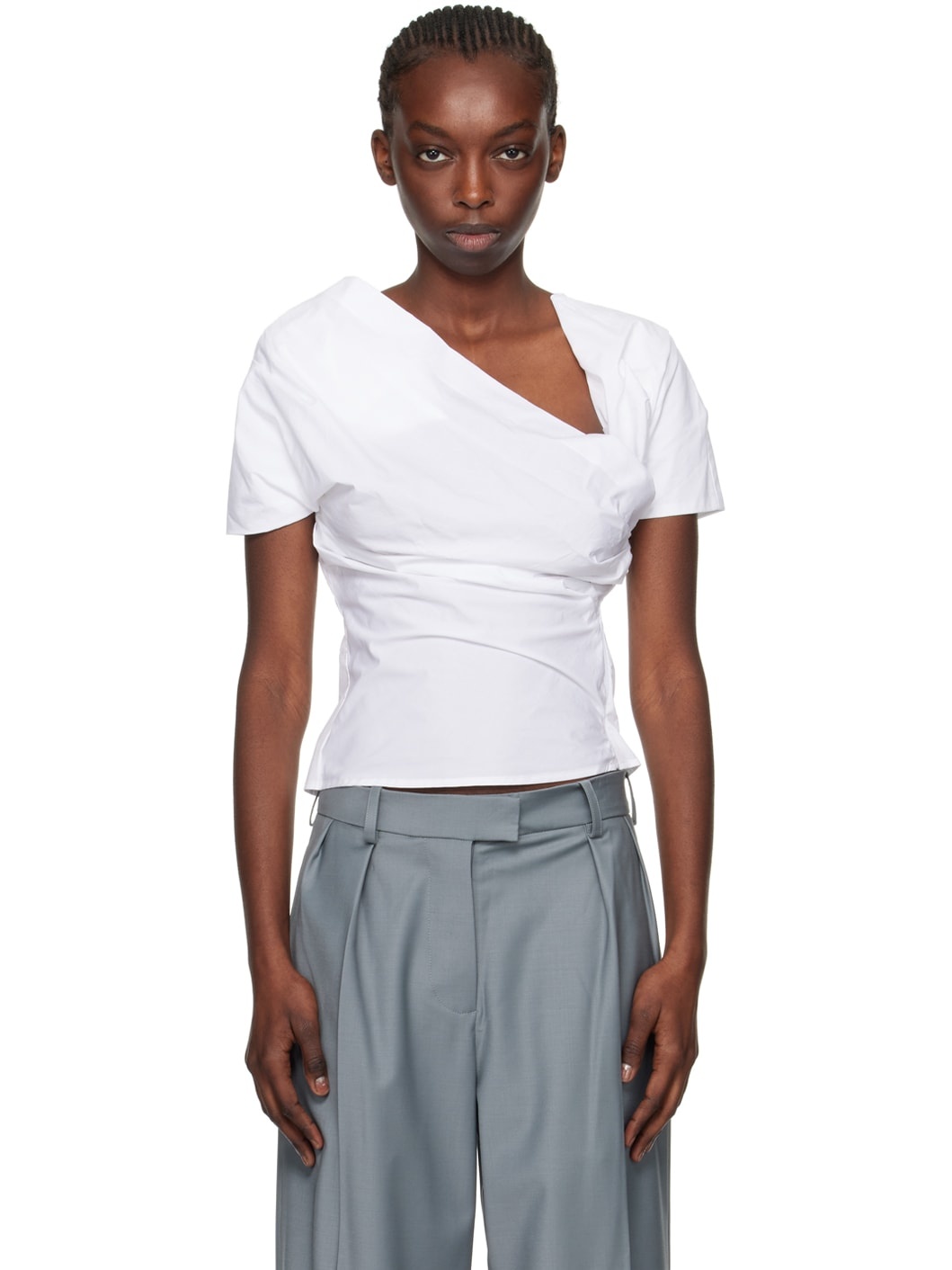 Cotton poplin blouse. Gathering throughout. · Wrap and layered construction · Frayed detailing at modified open placket · Concealed zip closure at side seam and front · Partial plain-woven organic cotton lining Supplier color: Bianco Body: 100% cotton. Lining: 100% organic cotton. Made in United Kingdom 241427F109002