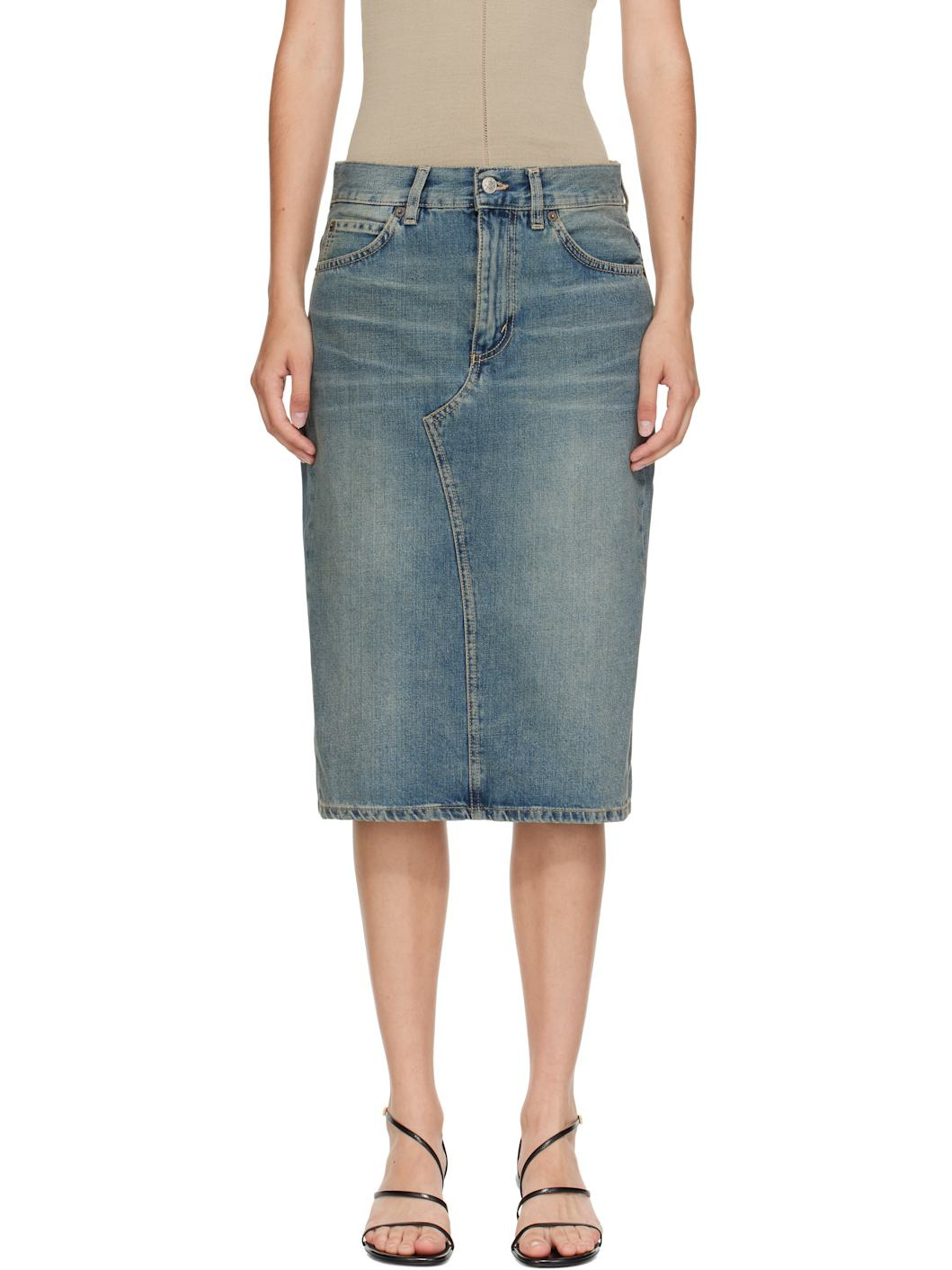 Non-stretch denim midi skirt. · Fading, whiskering, and subtle distressing throughout · Belt loops · Five-pocket styling · Zip fly · Leather logo patch at back waistband · Central vent at back hem · Contrast stitching in tan Supplier color: Used blue 100% cotton. Made in Italy 252446F092001