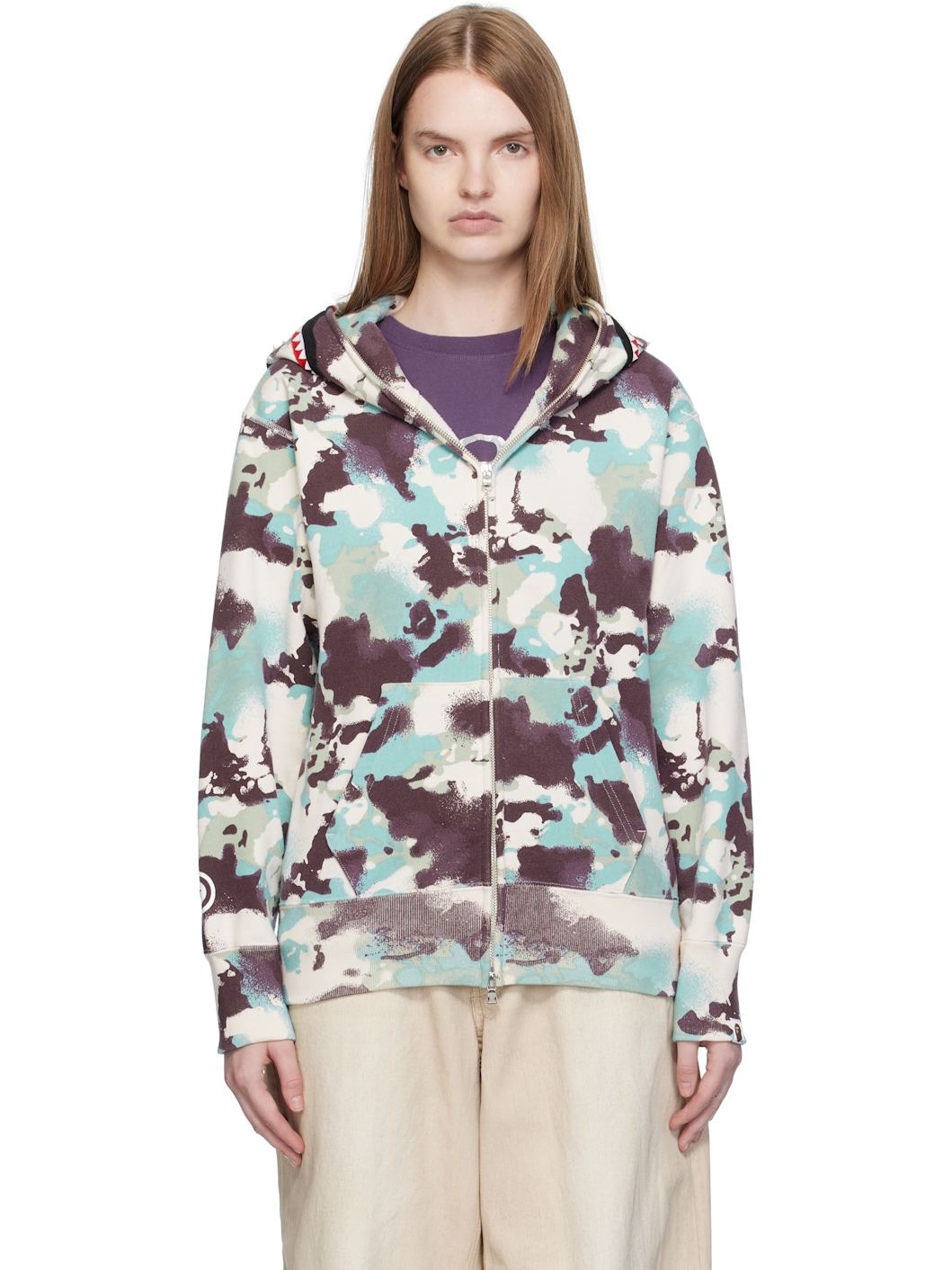 French terry hoodie. · Logo camouflage pattern printed throughout · Printed graphic and graphic appliques at hood · Two-way zip closure extends to hood · Patch pockets at front · Rib-knit hem and cuffs · Logo flag at cuff Supplier color: Multi 100% cotton. Made in Japan 251546F097006