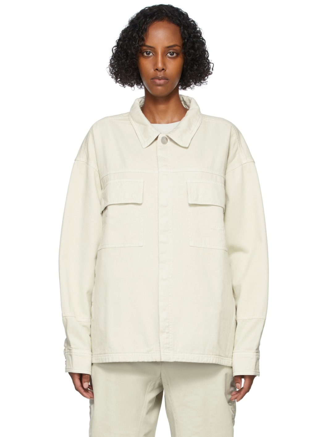 Long sleeve cotton twill jacket in beige. Spread collar. Concealed press-stud closure at front. Flap pockets and tonal embroidered logo at chest. Zippered pockets at waist. Two-button barrel cuffs. Central vent at back hem. Unlined. Logo-engraved silver-tone hardware. Supplier color: Bone 100% cotton. Made in Portugal 211891F063023