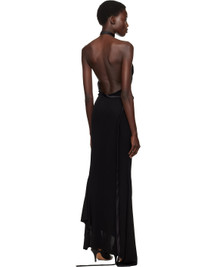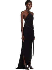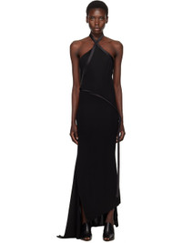 Viscose crepe maxi dress. Satin trim throughout. · Asymmetrical and paneled construction · Adjustable buttoned halter straps · Extended straps · Vented handkerchief hem Supplier color: Black Body: 100% viscose. Trim: 100% polyester. Made in United Kingdom 251678F055002