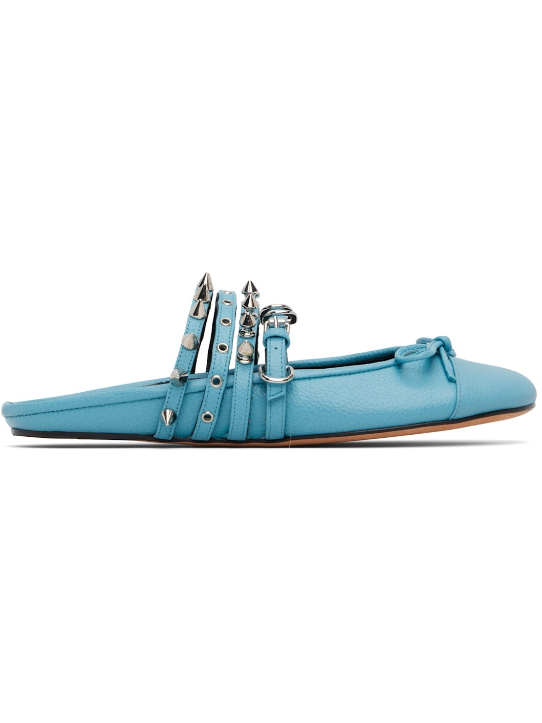 Grained leather ballerina-style mules in blue. · Square toe · Bow accent at vamp · Pin-buckle strap with D-rings at vamp · Grommets and studs at elasticized vamp straps · Logo stamp at leather footbed · Grained leather lining · Leather sole with rubber injection Supplier color: Blue Upper: leather. Sole: leather, rubber. Made in Spain 252526F121002