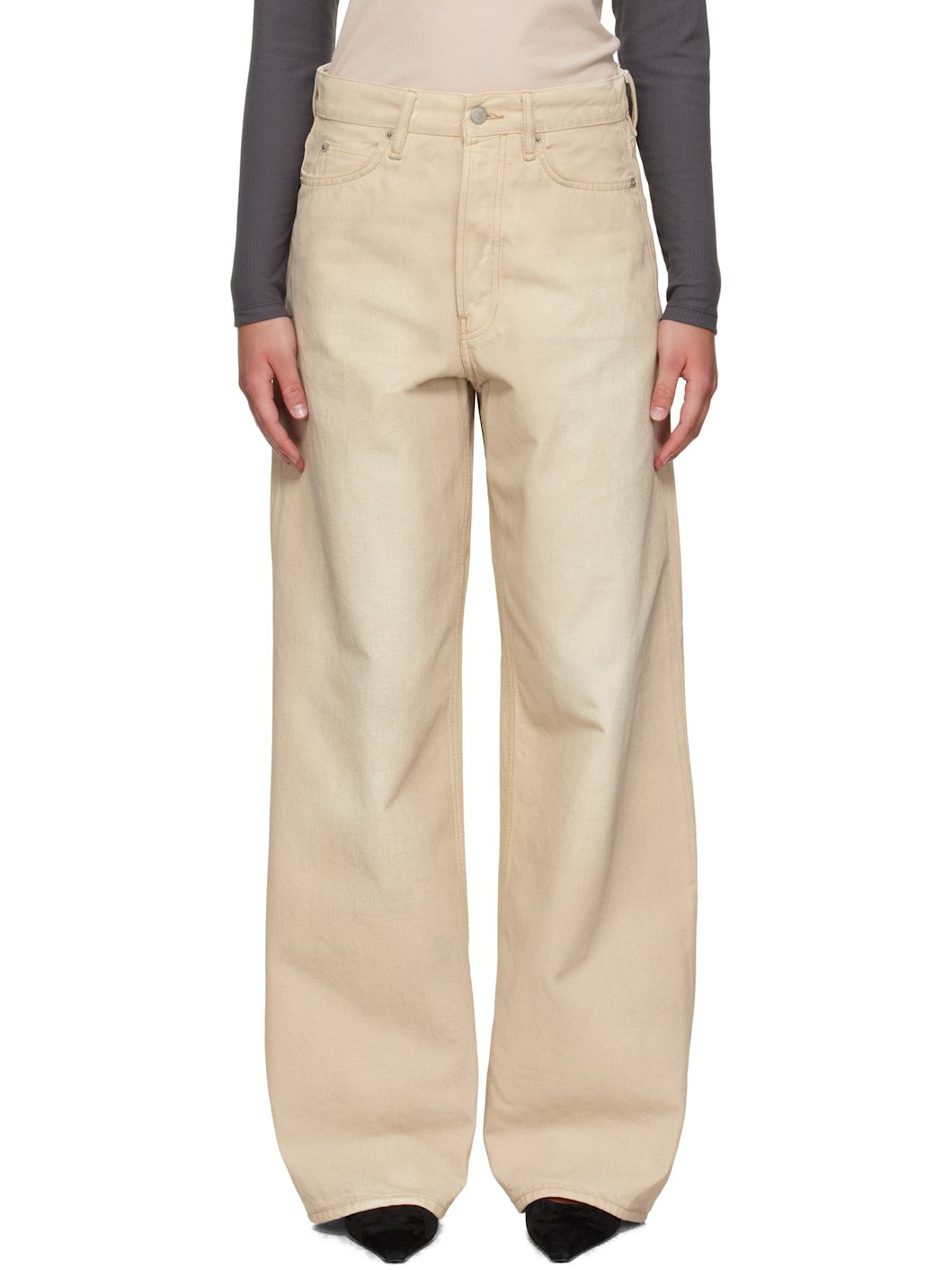 Coated non-stretch denim jeans. · Hand-applied discoloration throughout · Loose-fit · Low-to-mid rise · Belt loops · Five-pocket styling · Button fly · Leather logo patch at back waistband · Contrast stitching in tan Supplier color: Sand beige 100% cotton. Made in Italy 252129F069016
