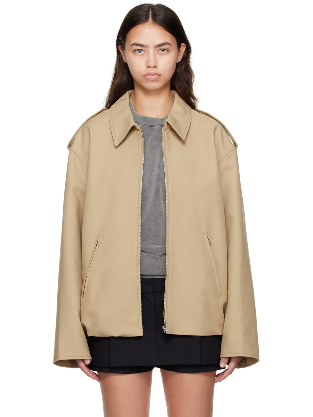 Organic cotton sateen jacket. · Spread collar · Zip closure · Zip pockets at front · Seam pockets at waist · Bungee-style drawstring at hem · Epaulets · Adjustable press-stud tab at cuffs · Logo patch at back collar · Full jersey lining Supplier color: Beige Body: 100% organic cotton. Lining: 100% cotton. Made in Romania 252129F063010