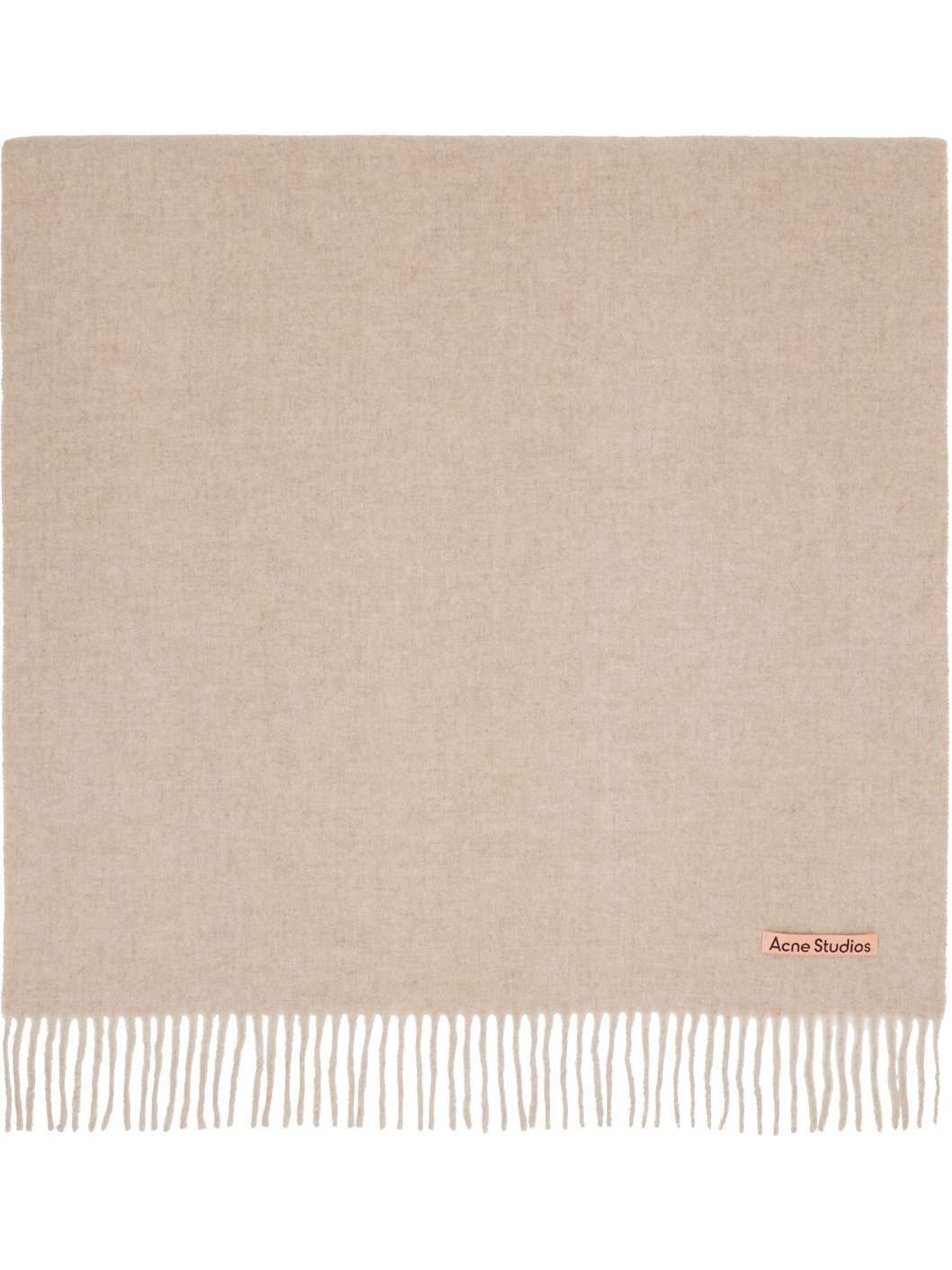 Rectangular RWS-certified wool flannel scarf. · Logo patch at face · Fringed detailing at ends · L78" x W27.5" Supplier color: Oatmeal melange 100% wool. Made in Italy 252129M150002