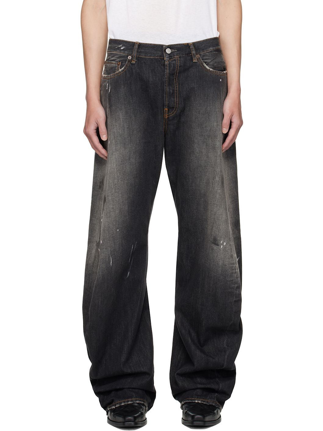 Non-stretch organic cotton denim jeans. · Fading and paint splatters throughout · Belt loops · Five-pocket styling · Button fly · Distressing at front and waist · Seams at front · Curved legs · Leather logo patch at back waistband Each item is unique. Please note patterning may vary slightly. Supplier color: Black 100% organic cotton. Made in Italy 252129M186039