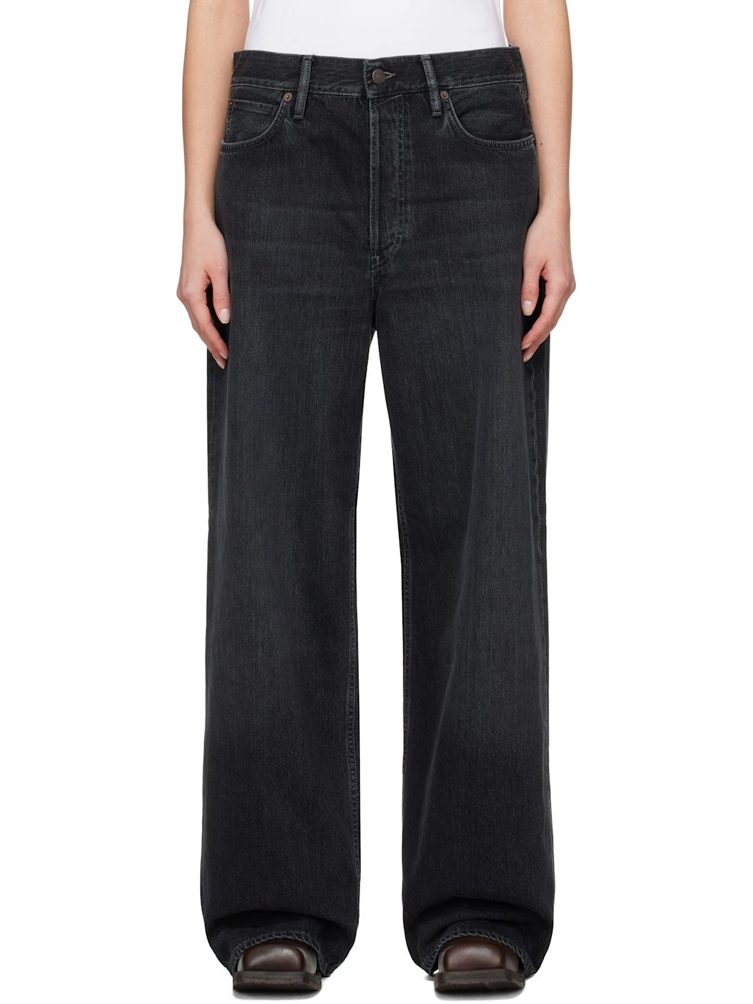 Non-stretch organic cotton denim jeans. Fading throughout. · Baggy-fit and wide-leg · Low-rise · Belt loops · Five-pocket styling · Button-fly · Pink stitching at back pockets · Leather logo patch at back waistband · Logo-engraved antiqued copper-tone hardware Supplier color: Black 100% cotton. Made in Italy 251129F069029