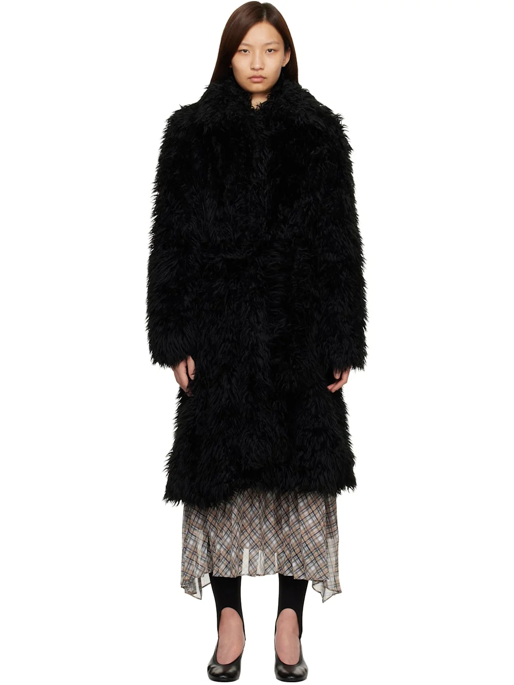 Faux-fur coat. · Spread collar · Concealed hook-eye closure · Seam pockets at waist · Belt loops and detachable self-tie belt · Padded shoulders · Logo plaque at back collar · Central vent at back hem · Full logo-woven satin lining Supplier color: Black Body: 80% acrylic, 20% polyester. Lining: 50% acetate, 50% viscose. Made in Bulgaria 261129F059000