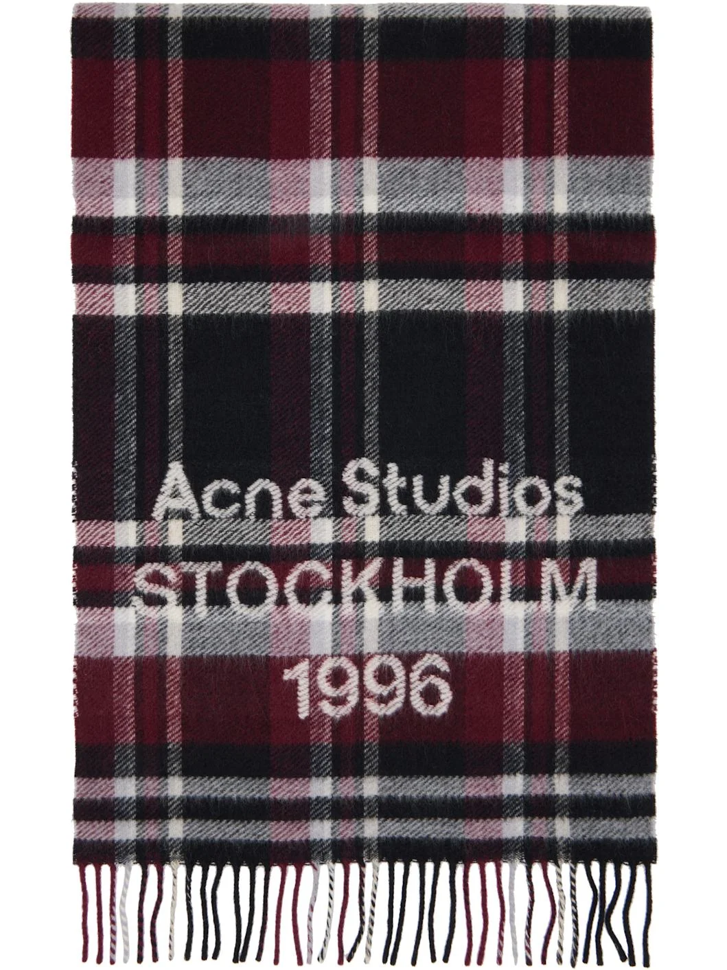 Rectangular wool-blend flannel scarf. · Check pattern throughout · Jacquard logo at face · Fringed detailing at ends · L73" x W16" Supplier color: Black/Burgundy 98% wool, 2% nylon. Made in Italy 261129F028009