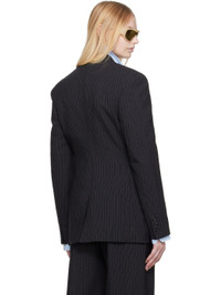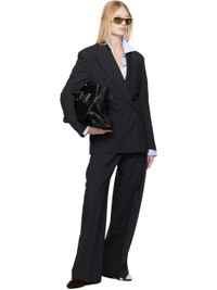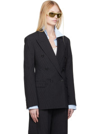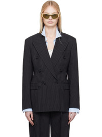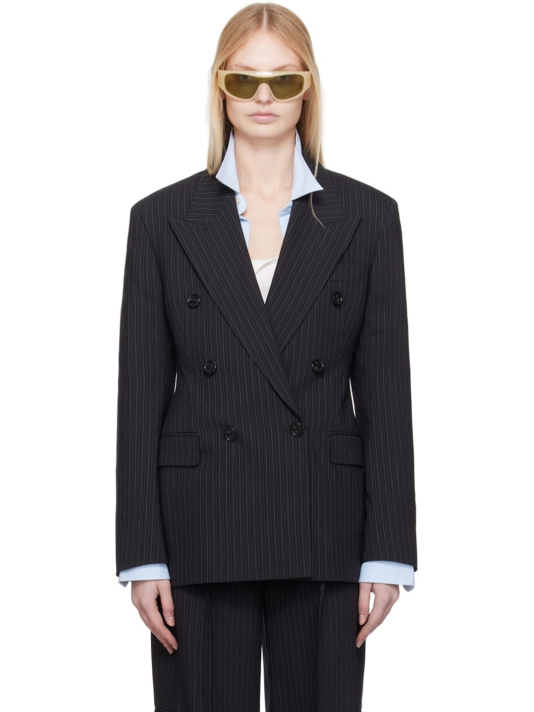 Stretch wool- and cotton-blend tweed blazer. Pinstripes throughout. · Peaked lapel · Double-breasted button closure · Welt pocket and flap pockets · Padded shoulders · Four-button surgeon's cuffs · Central vent at back hem · Welt pockets at interior · Full logo-woven satin lining Supplier color: Black Body: 74% wool, 24% cotton, 2% elastane. Lining: 50% acetate, 50% viscose. Made in Lithuania 251129F057000