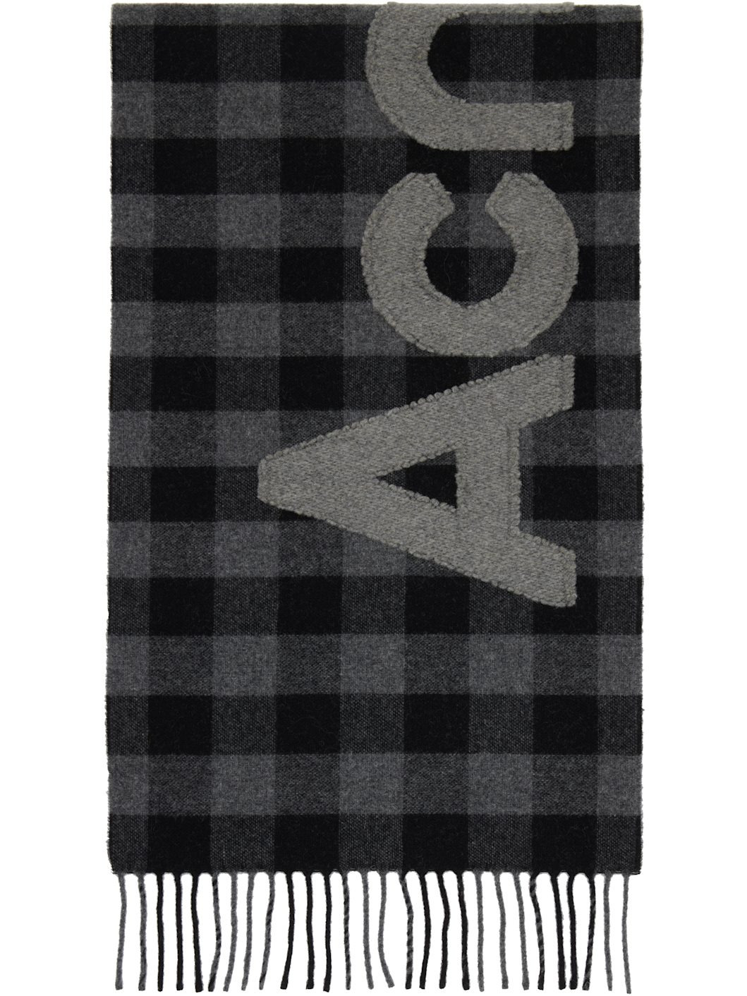 Rectangular felted knit wool-blend scarf. · RWS-certified wool · Check pattern throughout · Fil-coupe logo at face · Fringed ends · L80" x W14.75" Supplier color: Black/Grey 95% wool, 5% nylon. Made in Italy 252129F028026