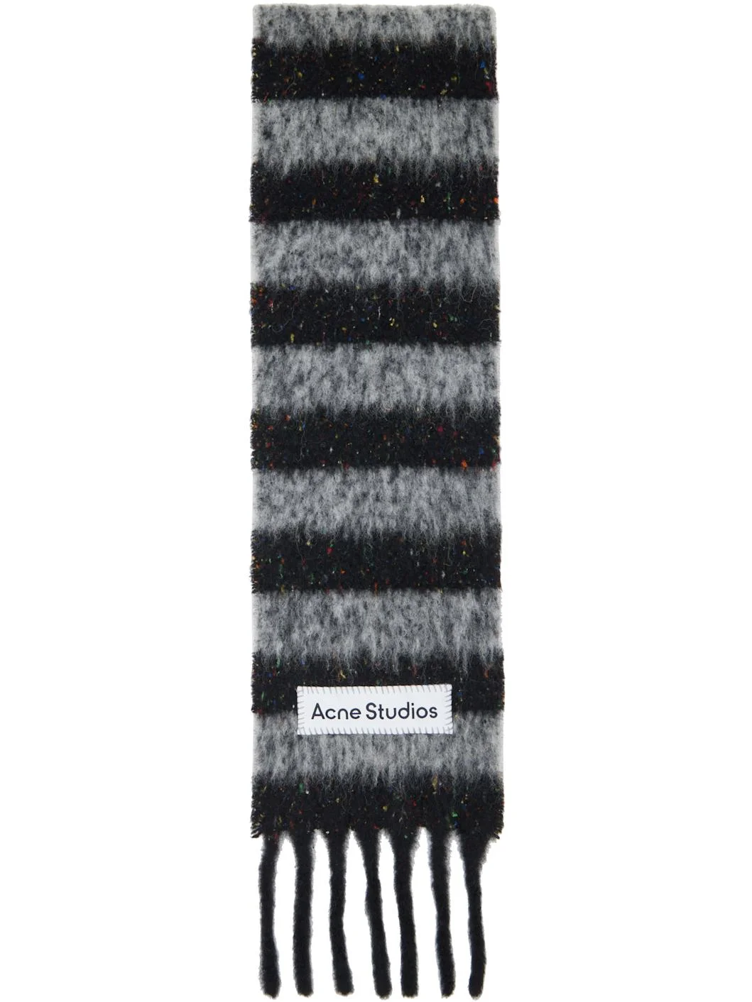 Rectangular brushed alpaca- and wool-blend flannel scarf. · Stripes throughout · Logo patch at face · Fringed detailing at ends · L76" x W7" Supplier color: Black/Grey 60% alpaca, 23% nylon, 11% wool, 6% silk. Made in Italy 261129M150031