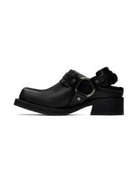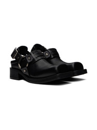 Buffed calfskin loafers in black. · Square toe · Harness-style overlay at ankle · Logo embossed at pin-buckle slingback strap · Buffed calfskin lining · Stacked rubber block heel · Treaded rubber sole · Logo-engraved antiqued silver-tone hardware · Heel: H1.5" Supplier color: Black Upper: calfskin. Sole: rubber. Made in Italy 242129F121000