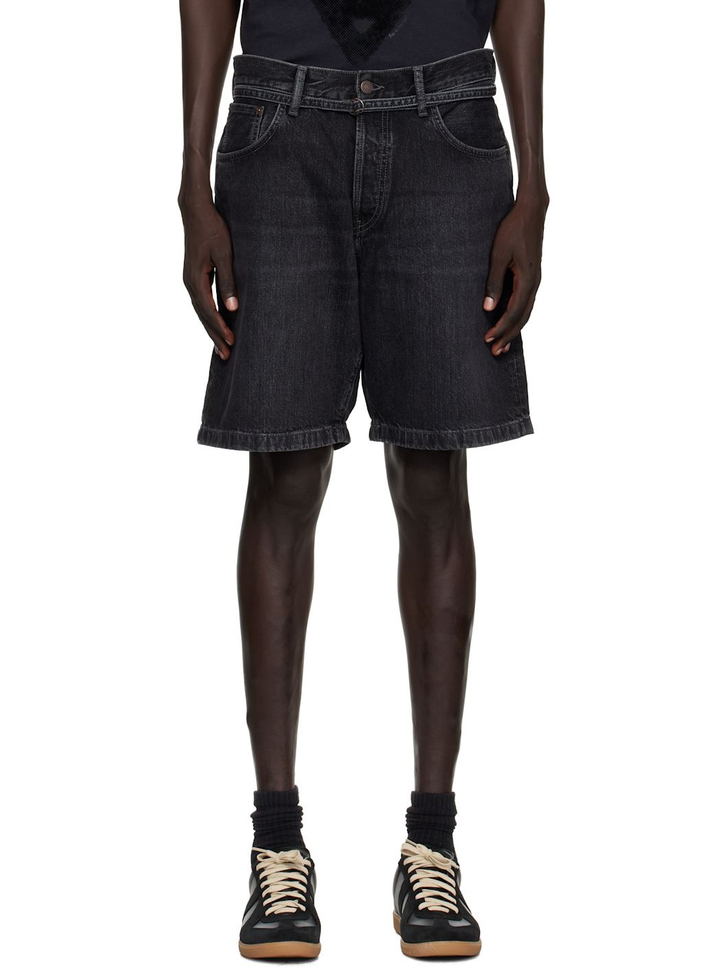Non-stretch organic cotton denim shorts. · Fading and whiskering throughout · Straight-leg and loose-fit · Belt loops and detachable cinch belt · Five-pocket styling · Button fly · Leather logo patch at back waistband · Logo-engraved bronze-tone hardware Supplier color: Black Body: 100% cotton. Trim: 100% leather. Made in Italy 252129M193000
