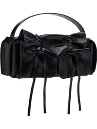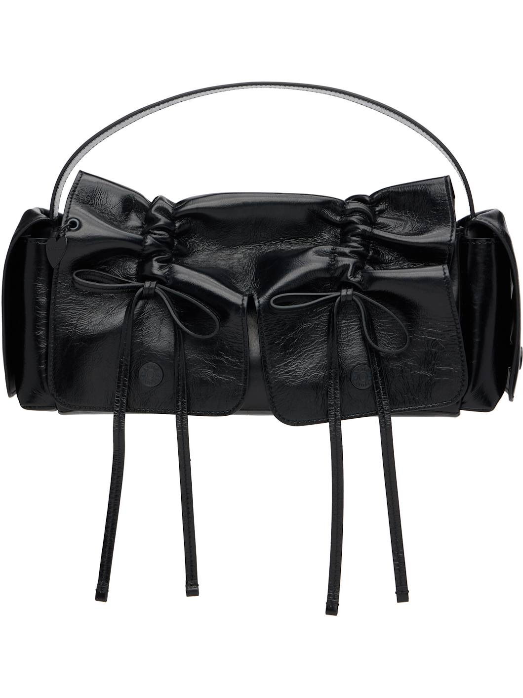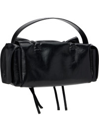 Crinkled calfskin top handle bag. · Logo embossed at adjustable shoulder strap · Logo charm and drawstrings at face · Flap pocket at sides · Magnetic flap · Patch pocket at interior · Buffed faux-leather lining · H8" x W13.5" x D4" Supplier color: Black Calfskin. Made in Italy 252129F046006