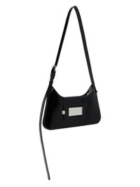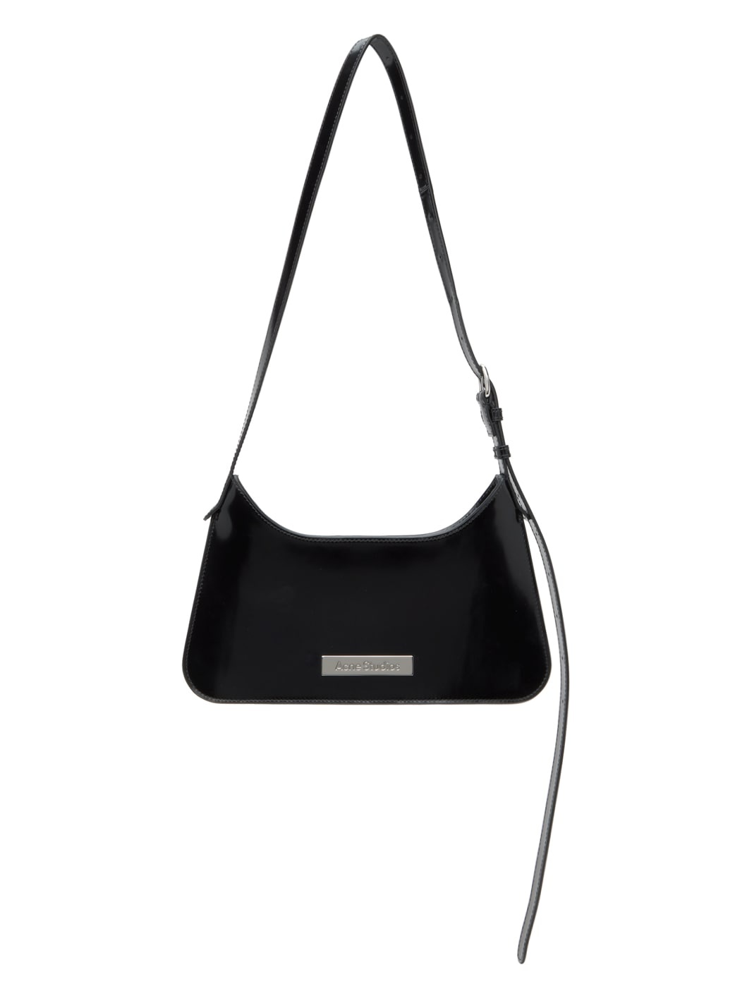 Patent calfskin shoulder bag in black. · Adjustable shoulder strap · Logo plaque at face · Accordion panel at sides · Removable mirror and card slot at back · Zip closure · Patch pocket at interior · Buffed faux-leather lining · H5.5" x W11.5" x D1" Supplier color: Black Body: 100% calfskin. Lining: 50% polyurethane, 50% polyester. Made in Italy 242129F048048