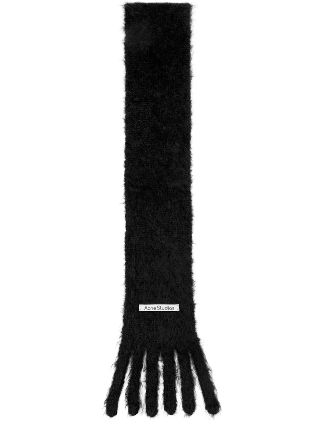 Rectangular brushed-knit mohair- and wool-blend scarf. · Calfskin logo patch at face · Fringed detailing at ends · L88" x W5" Supplier color: Black Body: 70% mohair, 30% wool. Trim: 100% calfskin. Made in Italy 261129F028017
