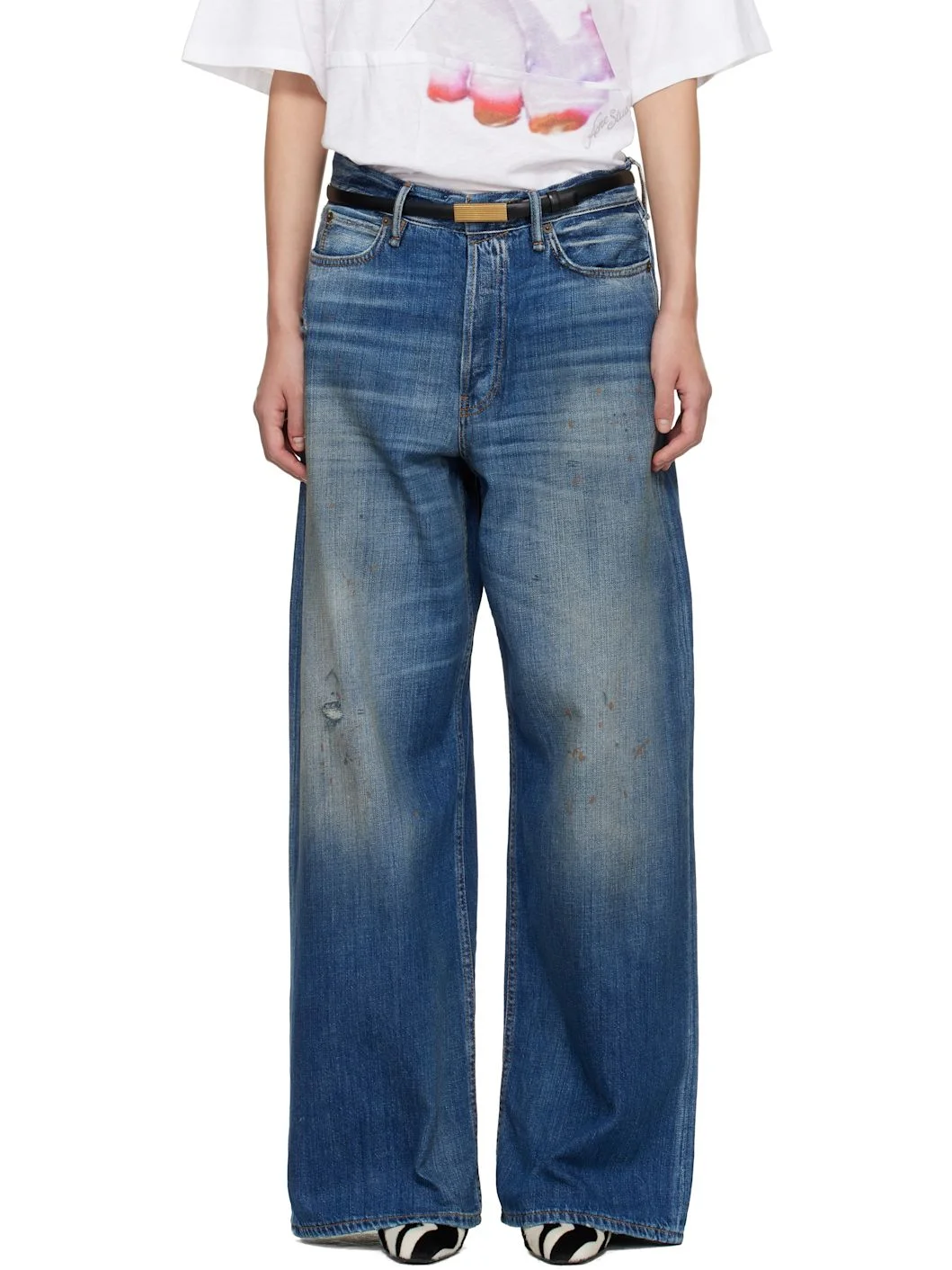 Loose-fit stonewashed non-stretch denim jeans. · Fading, whiskering, distressing, and paint splatter throughout · Low-rise · Belt loops · Five-pocket styling · Button fly · Leather logo patch at back waistband · Logo-engraved antiqued copper-tone hardware · Contrast stitching in tan Supplier color: Mid Blue Body: 100% cotton. Trim: 100% leather. Made in Italy 261129F069032