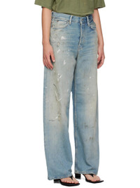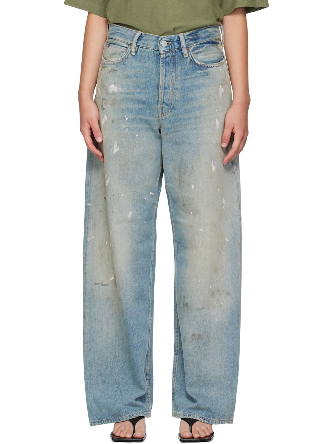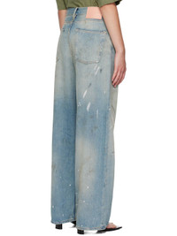 Non-stretch cotton-blend denim jeans. · Distressing, whiskering, discoloration, and paint splatter throughout · Belt loops · Five-pocket styling · Button fly · Leather logo patch at back waistband · Contrast stitching in tan Supplier color: Light blue 60% cotton, 40% lyocell. Made in Italy 252129F069018