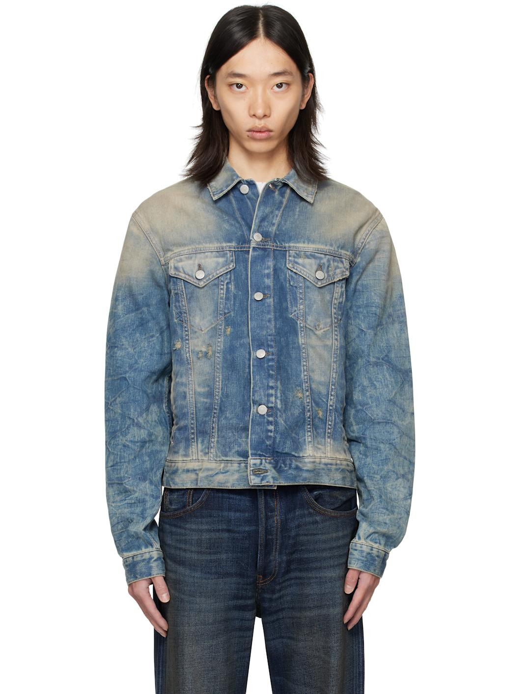 Non-stretch denim jacket. · Fading and distressing throughout · Spread collar · Button closure · Flap pockets at chest · Welt pockets at waist · Buttoned cuffs · Adjustable buttoned tabs at back hem Supplier color: Auz Mid Blue 100% cotton. Made in Italy 252129M177006