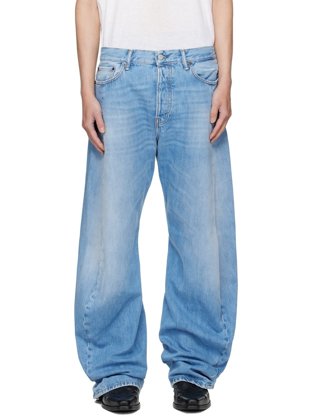 Non-stretch organic cotton denim jeans. · Fading and whiskering throughout · Belt loops · Distressing at front and waist · Five-pocket styling · Button fly · Seams at front · Curved legs · Leather logo patch at back waistband · Contrast stitching in tan Supplier color: Light blue 100% organic cotton. Made in Italy 252129M186036