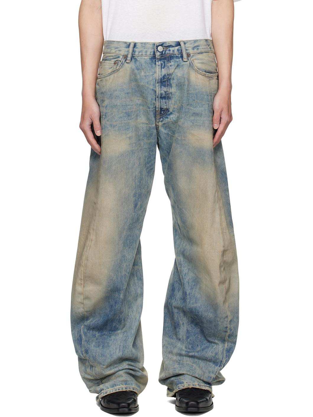 Non-stretch organic- and recycled-blend cotton denim jeans. · Mineral-dyed · Discoloration and distressing throughout · Wide-leg · Low-rise · Belt loops · Five-pocket styling · Button fly · Seams at front · Curved legs · Leather logo patch at back waistband · Contrast stitching in tan Supplier color: Auz Mid Blue 80% organic cotton, 20% recycled cotton. Made in Italy 252129M186037