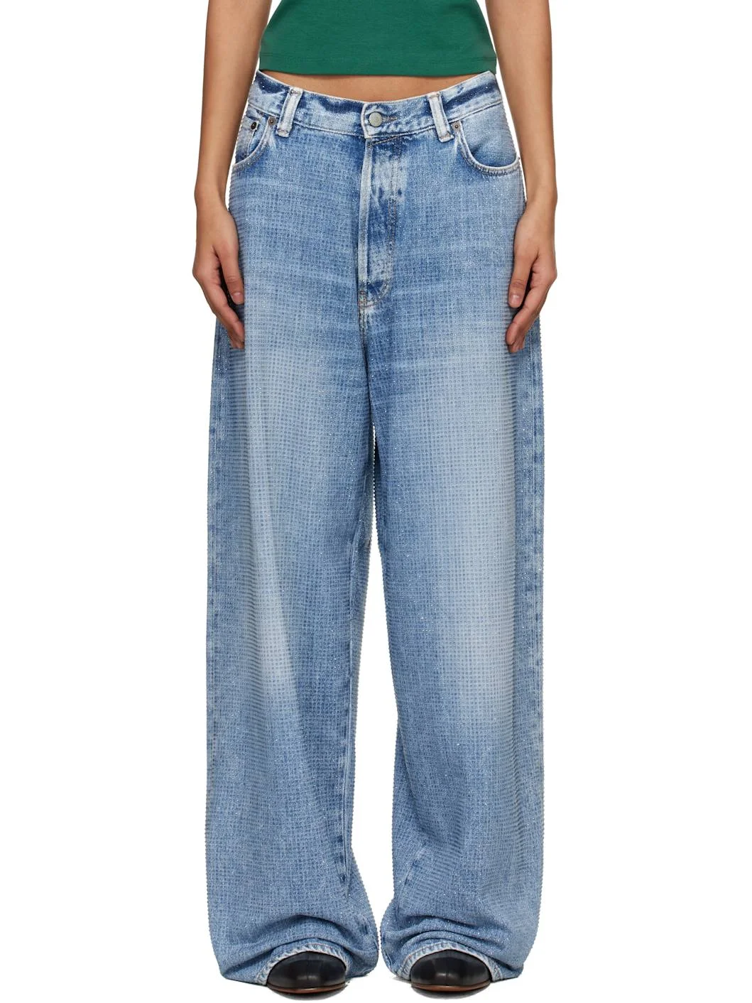 Loose-fit non-stretch cotton- and viscose-blend denim jeans. · Fading, whiskering, and rhinestones throughout · Low-rise · Belt loops · Five-pocket styling · Button fly · Leather logo patch at back waistband · Logo-engraved antiqued silver-tone hardware · Contrast stitching in beige Supplier color: Light Blue Body: 43% cotton, 43% viscose, 14% polyester. Trim: 100% leather. Made in Italy 261129F069012