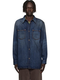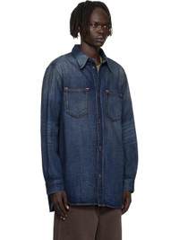 Non-stretch denim shirt. · Fading, smudging, and whiskering throughout · Spread collar · Button closure · Patch pockets at chest · Shirttail hem · Dropped shoulders · Buttoned barrel cuffs · Logo patch at back collar · Logo-engraved antiqued bronze-tone hardware · Contrast stitching in tan Supplier color: Dark blue Body: 100% cotton. Trim: 100% leather. Made in Italy 252129M192011