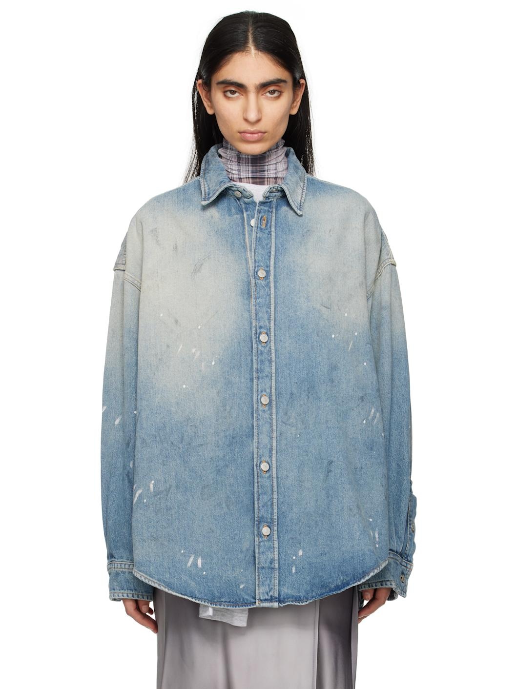 Stretch organic cotton-blend denim shirt. Smudging, paint splatter, and subtle distressing throughout. · Spread collar · Button closure · Shirttail hem · Single-button barrel cuffs · Logo-woven locker loop and pleats at back yoke · Logo-engraved silver-tone hardware · Contrast stitching in tan Supplier color: Light blue 60% organic cotton, 40% lyocell. Made in Italy 251129F109003