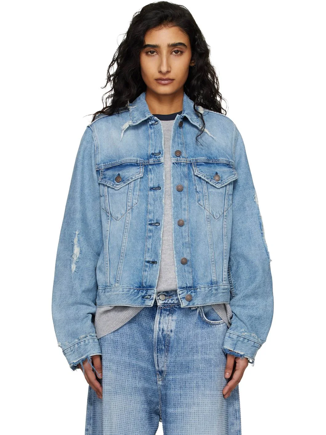 Non-stretch denim jacket. · Fading, distressing, frayed edges, and rips throughout · Spread collar · Button closure · Flap pockets at chest · Buttoned barrel cuffs · Adjustable button tabs at back hem · Logo-engraved antiqued copper-tone hardware · Contrast stitching in beige Supplier color: Light Blue 100% cotton. Made in Italy 261129F060012