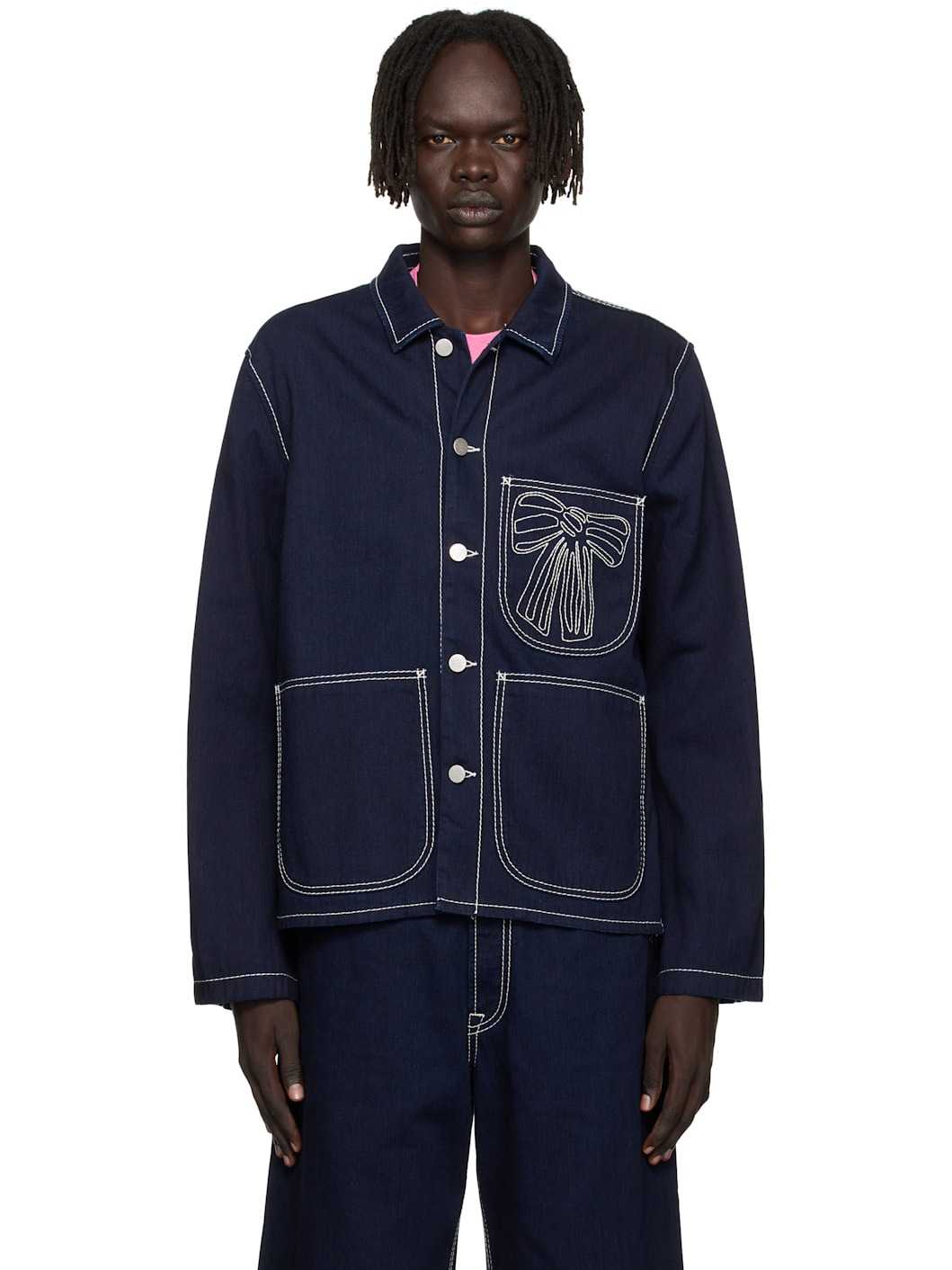 Non-stretch organic cotton denim jacket. · Spread collar · Button closure · Embroidered graphic at chest · Patch pockets at front · Unlined · Logo-engraved silver-tone hardware · Contrast stitching in white Supplier color: Indigo blue 100% cotton. Made in Italy 252129M177002