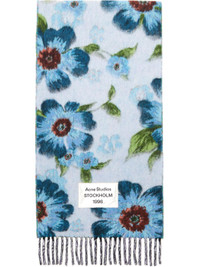 Rectangular brushed wool-blend flannel scarf. · Jacquard floral pattern throughout · Jacquard logo and logo patch at face · Fringed detailing at ends · L73" x W12.5" Supplier color: Blue 62% wool, 20% nylon, 18% alpaca. Made in Italy 261129F028006