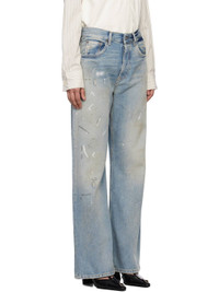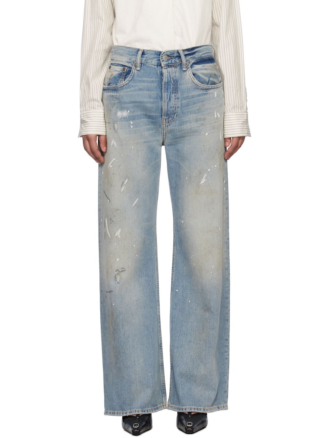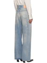 Loose-fit non-stretch organic cotton denim jeans. Fading, whiskering, and paint splatter throughout. · Wide-leg · Mid-rise · Belt loops · Five-pocket styling · Button-fly · Leather logo patch at back waistband · Contrast stitching in tan Supplier color: Light blue Body: 60% organic cotton, 40% lyocell. Trim: 100% leather. Made in Italy 251129F069017