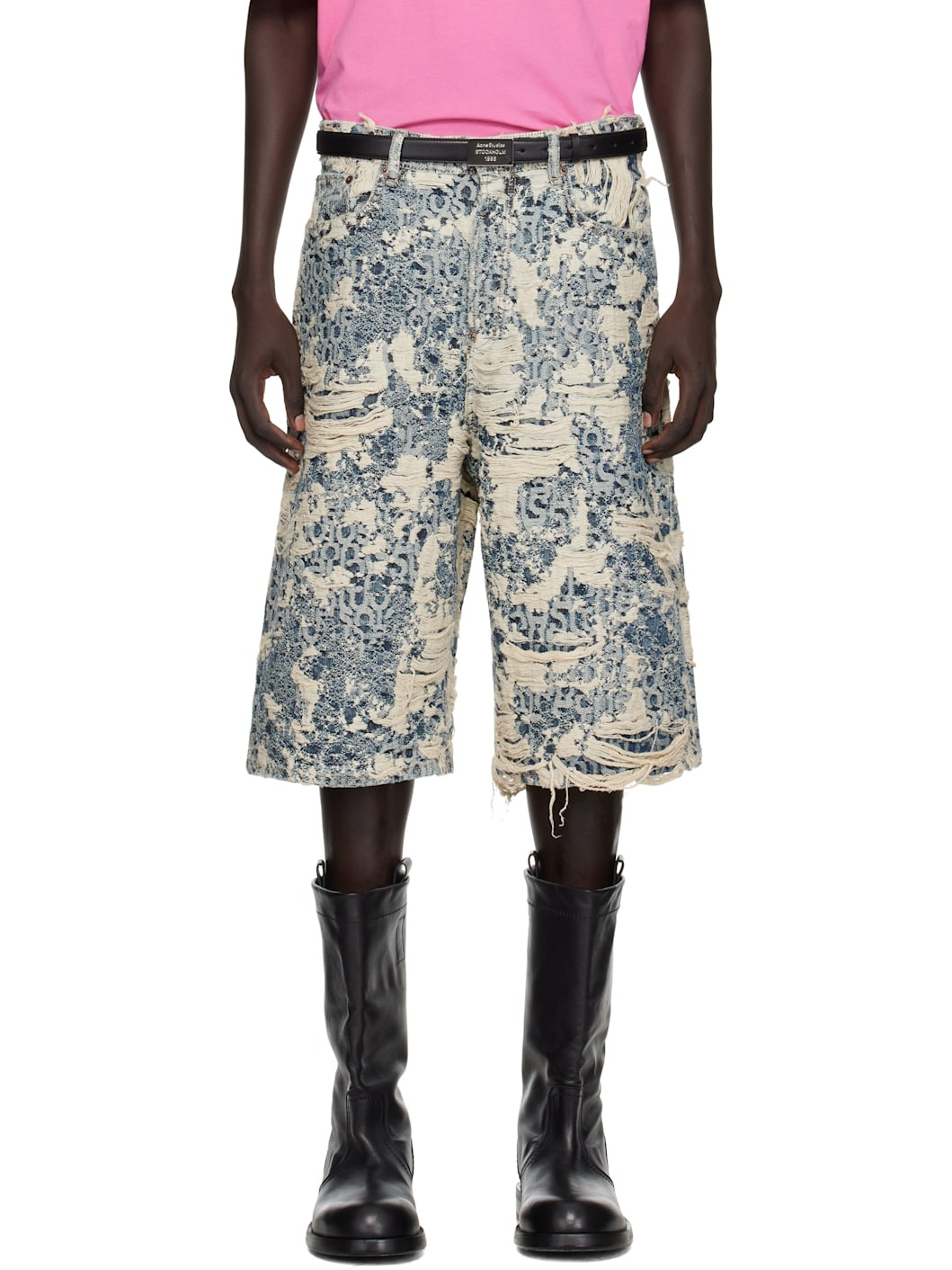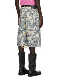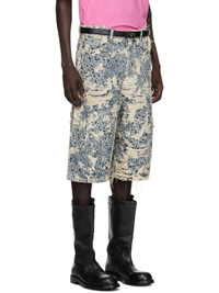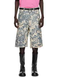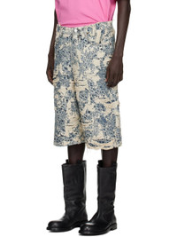 Non-stretch organic cotton denim shorts. · Enzyme-washed · Distressing and jacquard logo pattern throughout · Low-rise · Belt loops · Five-pocket styling · Button fly · Dropped inseam · Leather logo patch at back waistband Supplier color: Mid blue Body: 100% cotton. Trim: 100% leather. Made in Italy 252129M193006
